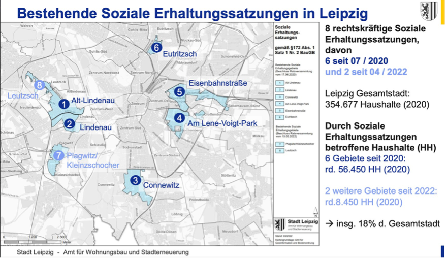 Die Leipziger Gebiete, in welchen soziale Erhaltungssatzungen eingeführten wurden, sind Connewitz, Reudnitz-Thonberg, Lindenau, Kleinzschocher, Leutzsch, Plagwitz, Eutritzsch sowie die Gebiete rund um den Lene-Voigt-Park und die Eisenbahnstraße (Stadt Leipzig 2023a: 47):
