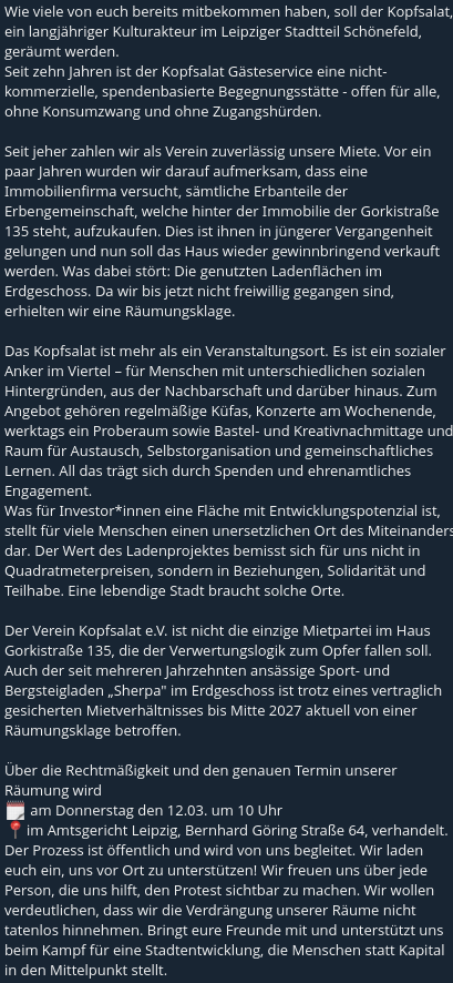 Wie viele von euch bereits mitbekommen haben, soll der Kopfsalat, ein langjähriger Kulturakteur im Leipziger Stadtteil Schönefeld, geräumt werden.